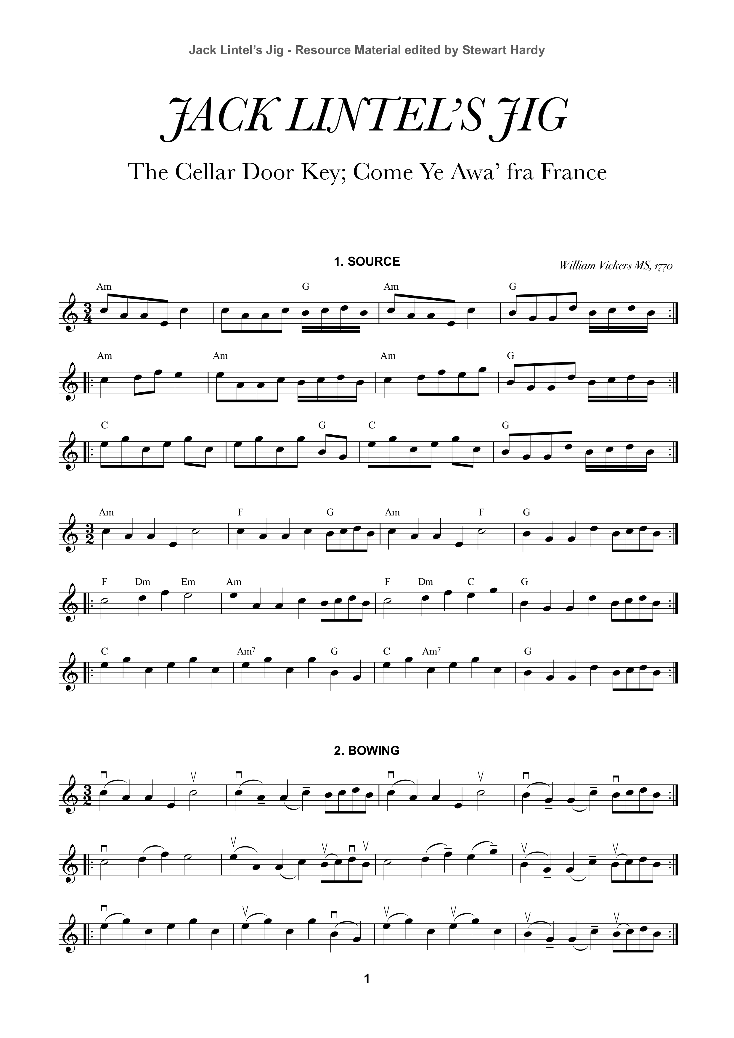 The downloadable bundles each include sheet music and audio files. The pdf file of the sheet music contains the source material with basic chords, a suggestion of the fiddle bowing which will help find the groove of the tune, suggestions for ornaments to bring the tune to life and sometimes ideas for double stops or a harmony line. The audio files are available in both mp3 and m4a (AAC iTunes) format. The tune is played as notated on the sheet music and at different speeds, sometimes with a count in to make it easier to play along. A more spontaneous version is often included which reflects how the tune might be played once it has become sufficiently familiar and liberated from the notation. If the sheet music contains a harmony line, this is recorded along with the tune.