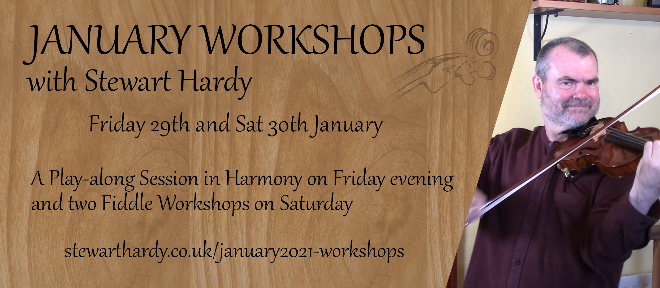 And there’s more! To brighten up the winter months during lockdown and with all that’s going on in the world, here is another set of workshops. Join me on the Friday evening, 29th January, for a Play-along Session with loads of harmonies provided, and for two Fiddle Workshops on Saturday 30th Jan.