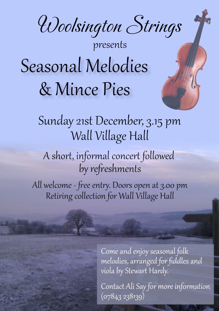 Woolsington Strings will be sharing a short, informal concert of folk tunes with a winter connection, arranged for fiddles and viola on Sunday 21st December at 3.15 pm in Wall Village Hall. Free event!