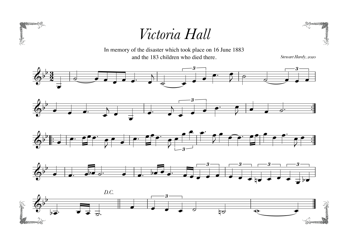The 16th June marks the anniversary of one of the North Easts most tragic events – the Victoria Hall disaster, which occurred in Sunderland in 1883. Some 2000 school children, mostly aged between 7 and 11, attended an afternoon variety show. With the promise of prizes for everyone there was a surge of children into an area of the hall without an adequate exit route and 183 were crushed to death. A marble statue of a grieving mother holding a dead child stands as a memorial in Sunderland’s Mowbrary Park. Many thanks to Steve Cogdon for commissioning the slow air, Victoria Hall, to mark the occasion. Another tune to come out of the project was Waltz for Lost Children. Audio and notation for both tunes are available free to download for the month of June 2021.